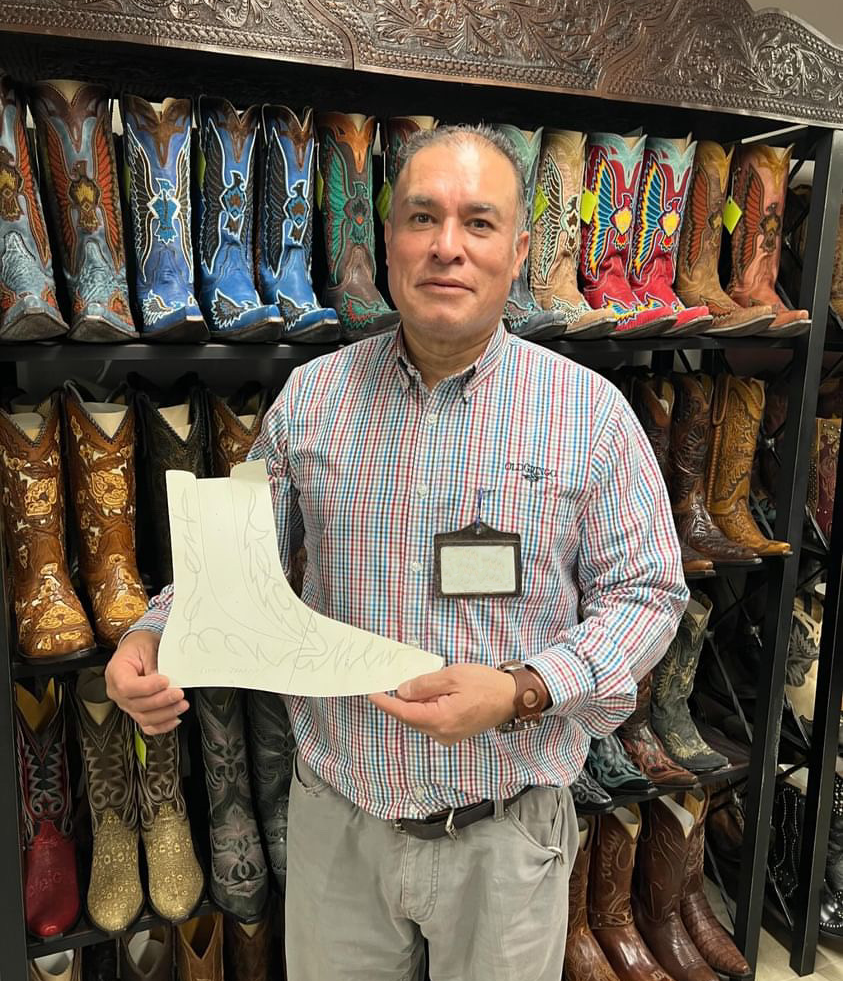 Nacho holding the pattern for the Zapata Boots