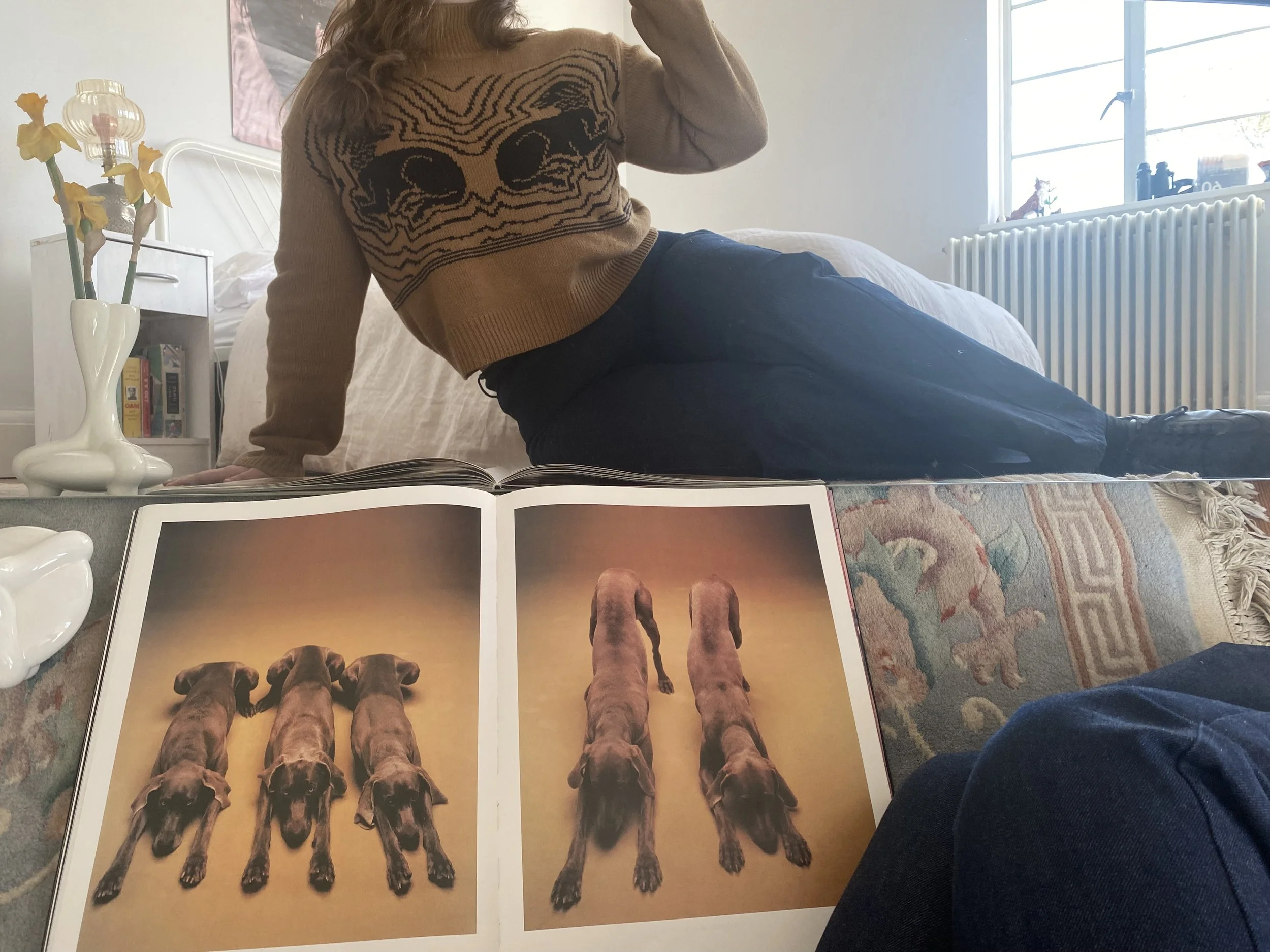 For example, in an extremely serendipitous moment, I recently happened to cross paths with Alexa Chung on my commute and had the opportunity to tell her about my article. In my quick debrief with Ms.Chung, she informed me that the sweater has a latin name. Unfortunately, when she told me this old world incantation it went in one ear and out the other. But the press release for the collection said that “Non Ducor, Duco” was emblazoned across T Shirts so I am using scholarly inference to assume that this is what she was referring to. Translation for those of us who have not kept up with our ancient tongues: I am not led, I lead. A very apropos message from the woman who's sartorial smoke signals digitally wallpapered the coming of age of a generation of girls for which she has become the blueprint. The aim of the collection was to explore powerful women, from Joan of Arc to Kate Bush whose song and album Hounds of Love inspired the design and name of my jumper. Fun fact, Hounds of Love was the first album where Kate Bush stepped into her power and took full creative control. Her previous record Dreaming was received with mixed critical acclaim, resulting in Kate deciding that she didn't care about fame or accolades. As a result, she decided she was going to create exactly what she wanted to, from her home studio, without compromise. A different kind of bravery from a young Joan leading troops through battle but harrowing nonetheless. On the cover of the album Bush is photographed with two Weimaraners named Bonnie and Clyde. Rumor has it, she borrowed them from a friend, much like how I borrowed my four legged editorial costar, Toby, from a neighbor.